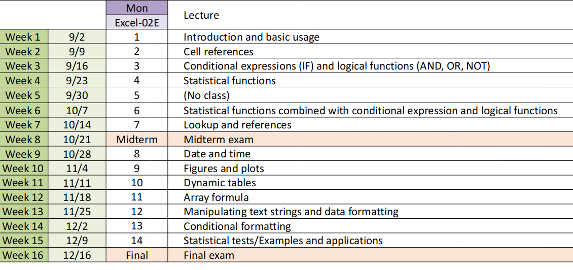 這門課有分上午班(英文授課)和下午班(中文授課),我是修上午班。課程內容主要為教你如何使用Excel的functions。Figure 2是我這班(英文班)的syllabus: